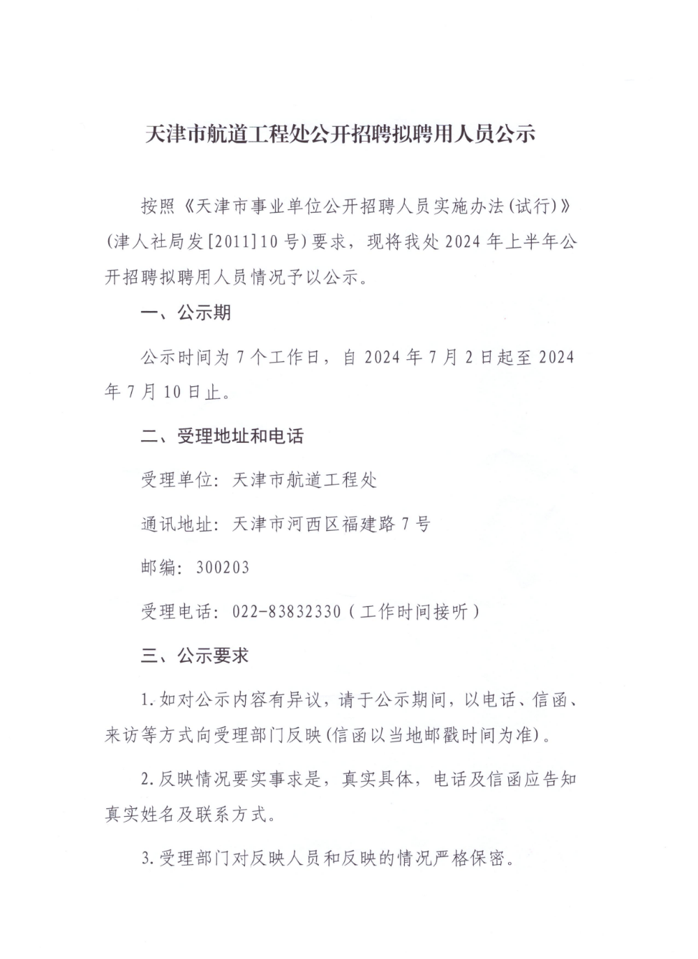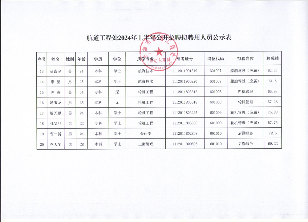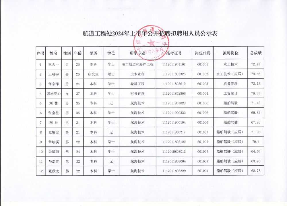 天津市航道工程处公开招聘拟聘用人员公示