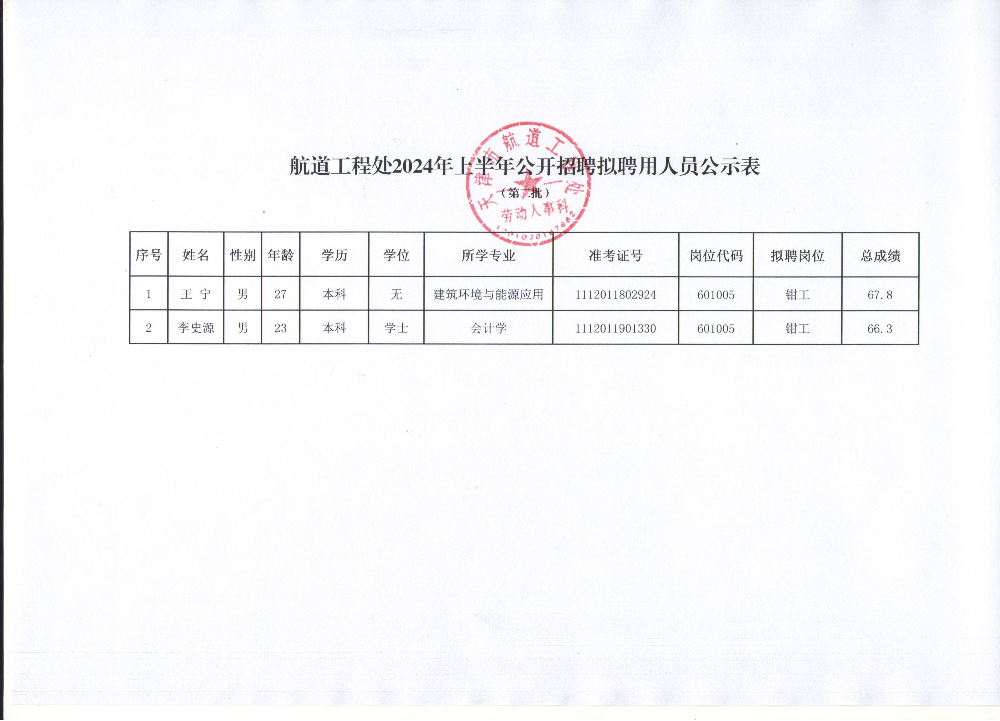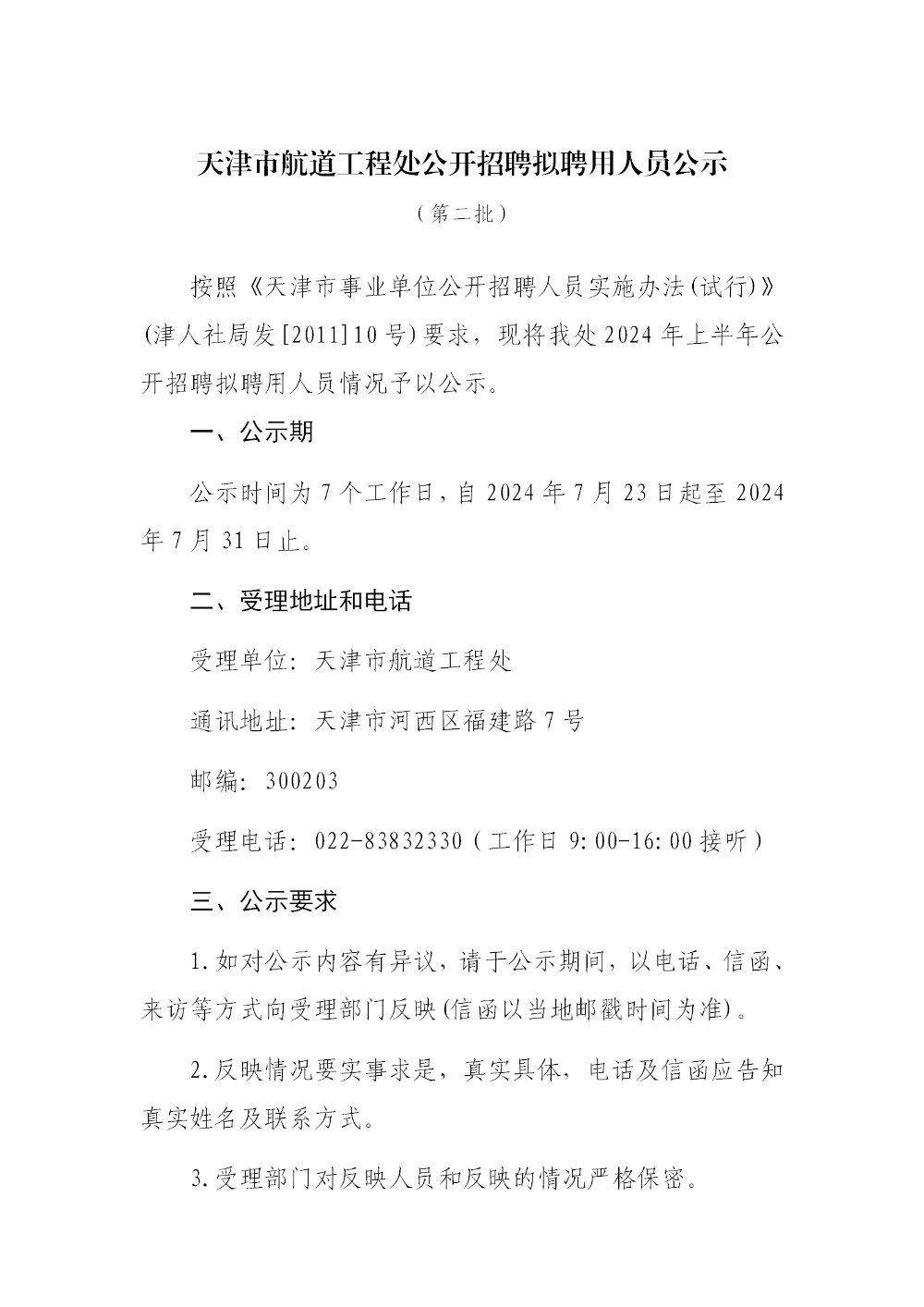 天津市航道工程处公开招聘拟聘用人员公示(第二批)